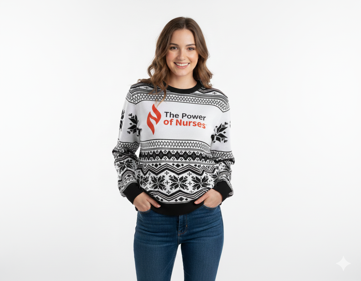 Celebrate the season in style while honoring the incredible impact of nurses! This black-and-white holiday sweater features a bold, festive design with classic snowflake patterns and intricate geometric details. At the center, the iconic The Power of Nurses™ logo made with soft, cozy fabric, this sweater is perfect for holiday gatherings, work celebrations, or simply spreading cheer. Show your pride and stay warm with purpose.